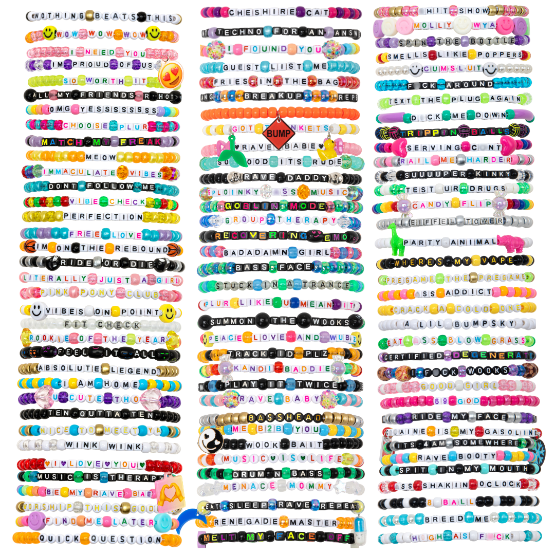 NEW FOR 2026: Discover the latest designs featuring new words, phrases, and colors — plus glow-in-the-dark beads, cute charms, and limited-edition styles inspired by real rave moments. Each pack brings fresh festival-ready kandi that shines day or night.
